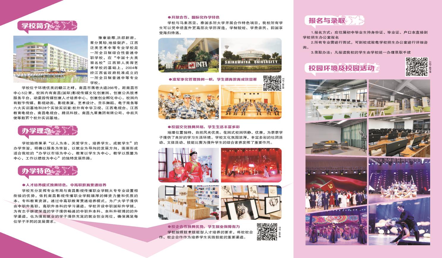 江西泛美藝術中等專業學校、江西麗人美容藝術學院、南昌影視傳播職業學院隸屬泛美職教集團,江西泛美藝術中等專業學校位于江西省省會南昌市,坐落在贛水環繞的蔣巷國家生態示范區,交通便利。學校擁有寬敞明亮的教學大樓,整潔舒適的學生公寓、有電化教室、計算機教室、多媒體教室、語音室、展示廳、多功能禮堂、圖書館。學校教學設備精良,生活設施完善,運動設施齊全。