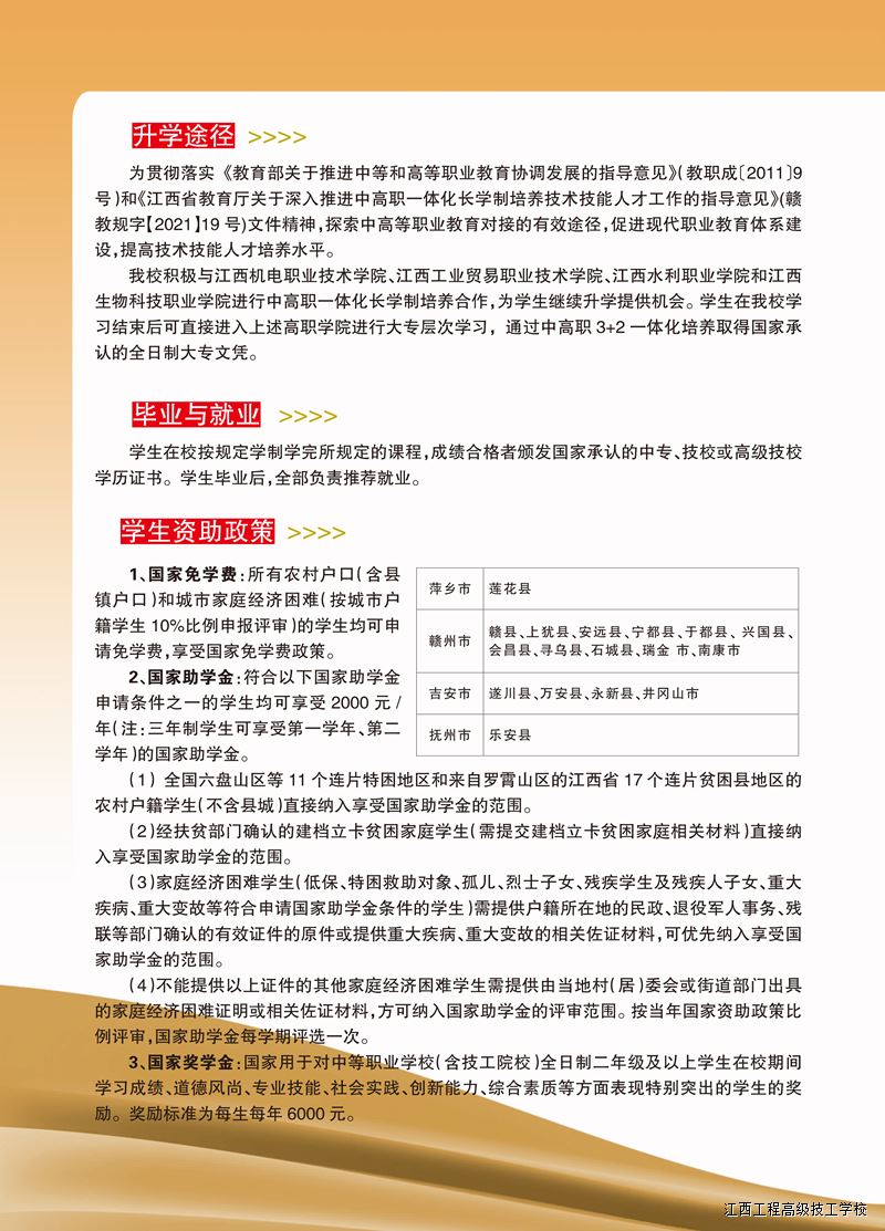 江西工程高級技工學校(江西工程學校)創建于1978年,隸屬于江西省地質局,2010年和2014年分別被江西省教育廳確認為國家級重點中等職業學校和達標中職學校,2020年被人力資源與社會保障部審定為國家級技能人才培訓基地。是一所擁有普通中專、高級技工、成人高等教育服務培訓為一體的綜合教育機構。主要為地質行業、社會和企業生產一線培養輸送中、高級技能人才。