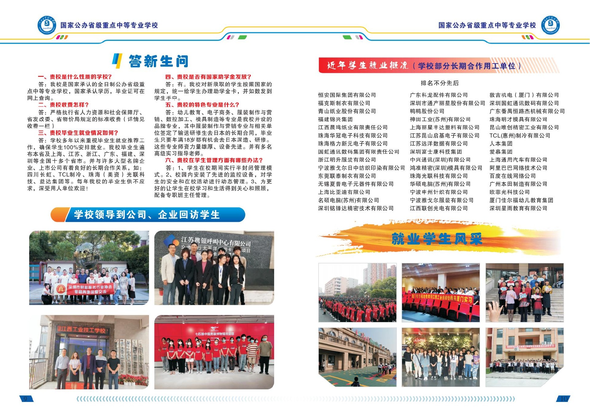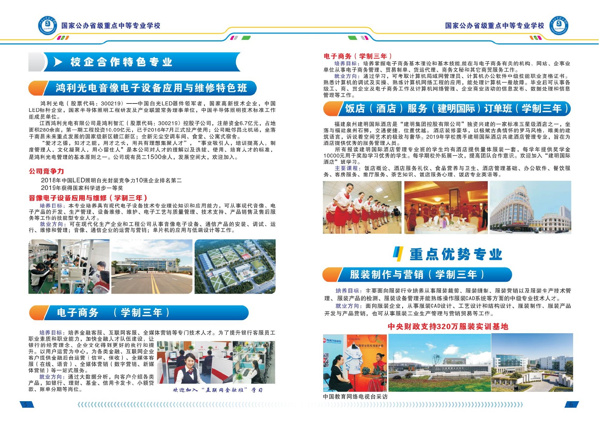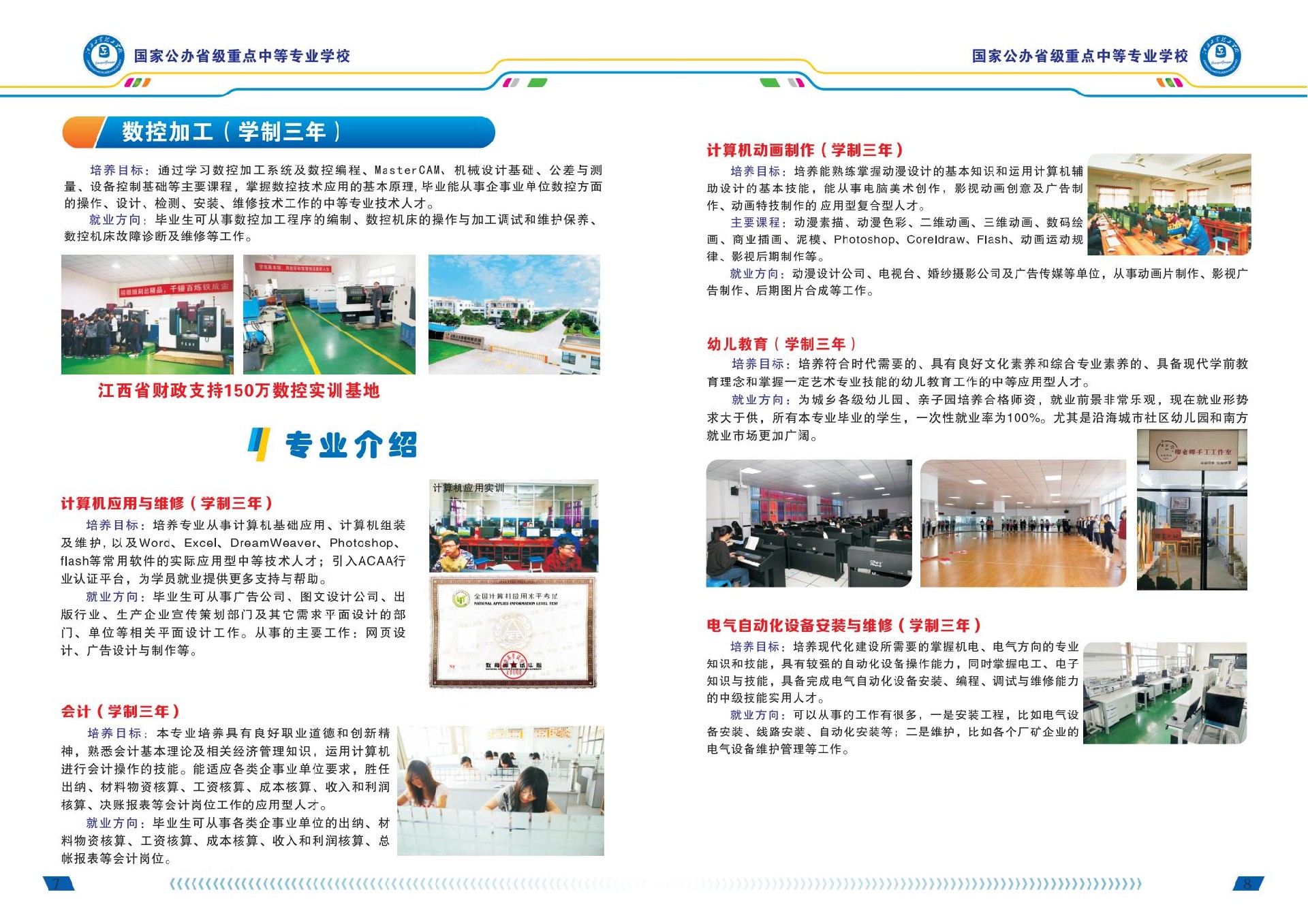隨著學校辦學規模的不斷擴大和發展,目前我校的特色骨干專業有服裝制作與營銷專業、數控模具專業、電子應用專業等。其中,“服裝制作與營銷專業”成功申報了省級示范專業,同時服裝制作與營銷專業是“中央財政支持的服裝專業實訓基地”重點建設專業;數控加工專業是“江西省數控專業實訓基地”重點建設專業。通過提高學生操作技能,強化實訓,工學結合,使畢業生深受省內外企業青睞和各界的歡迎。