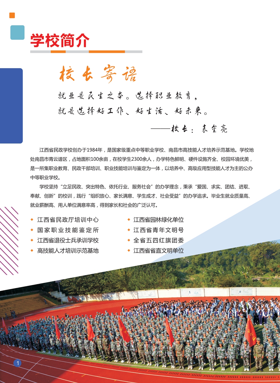 江西省民政學校于1 984年經江西省人民政府批準成立,隸屬于江西省民政廳,是一所集職業教育、民政干部培訓、職業技能培訓與鑒定為一體,以培養中、高級應用技能型人才為主的公辦全日制國家級重點中等職業學校。