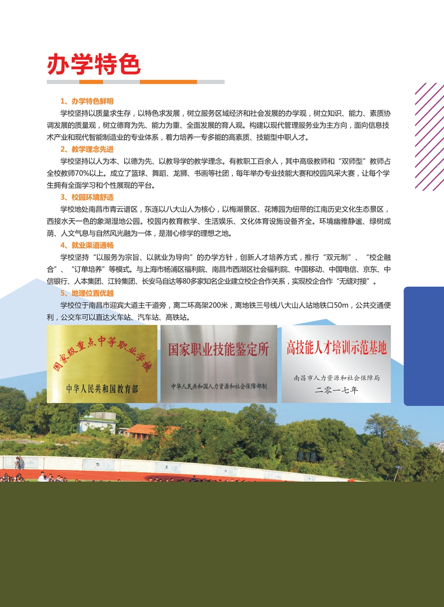 優美的育人環境 學校地處南昌市中心城區一青云譜八大山人梅湖景區。交通便利。校內綠樹掩映,鳥語花香,到處散發出生機勃勃的盎然氣息,是同學們學習生活的優雅環境,更是放飛夢想的青春花園。