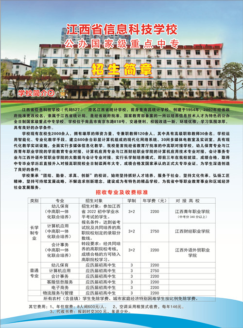 江西省信息科技學(xué)校(代碼527)。原名江西省統(tǒng)計(jì)學(xué)校,前身是創(chuàng)建于1954年的南昌統(tǒng)計(jì)學(xué)校,2007年經(jīng)省政府批準(zhǔn)更名為江西省信息科技學(xué)校,隸屬于江西省統(tǒng)計(jì)局,是經(jīng)省政府批準(zhǔn)、國(guó)家教育部備案的一所以培養(yǎng)信息技術(shù)人才為特色的公辦全日制國(guó)家級(jí)重點(diǎn)中專學(xué)校。學(xué)校位于南昌市南京東路818號(hào),交通便利,校園改造一新,環(huán)境優(yōu)雅,學(xué)習(xí)氛圍濃厚,具有良好的辦學(xué)條件。