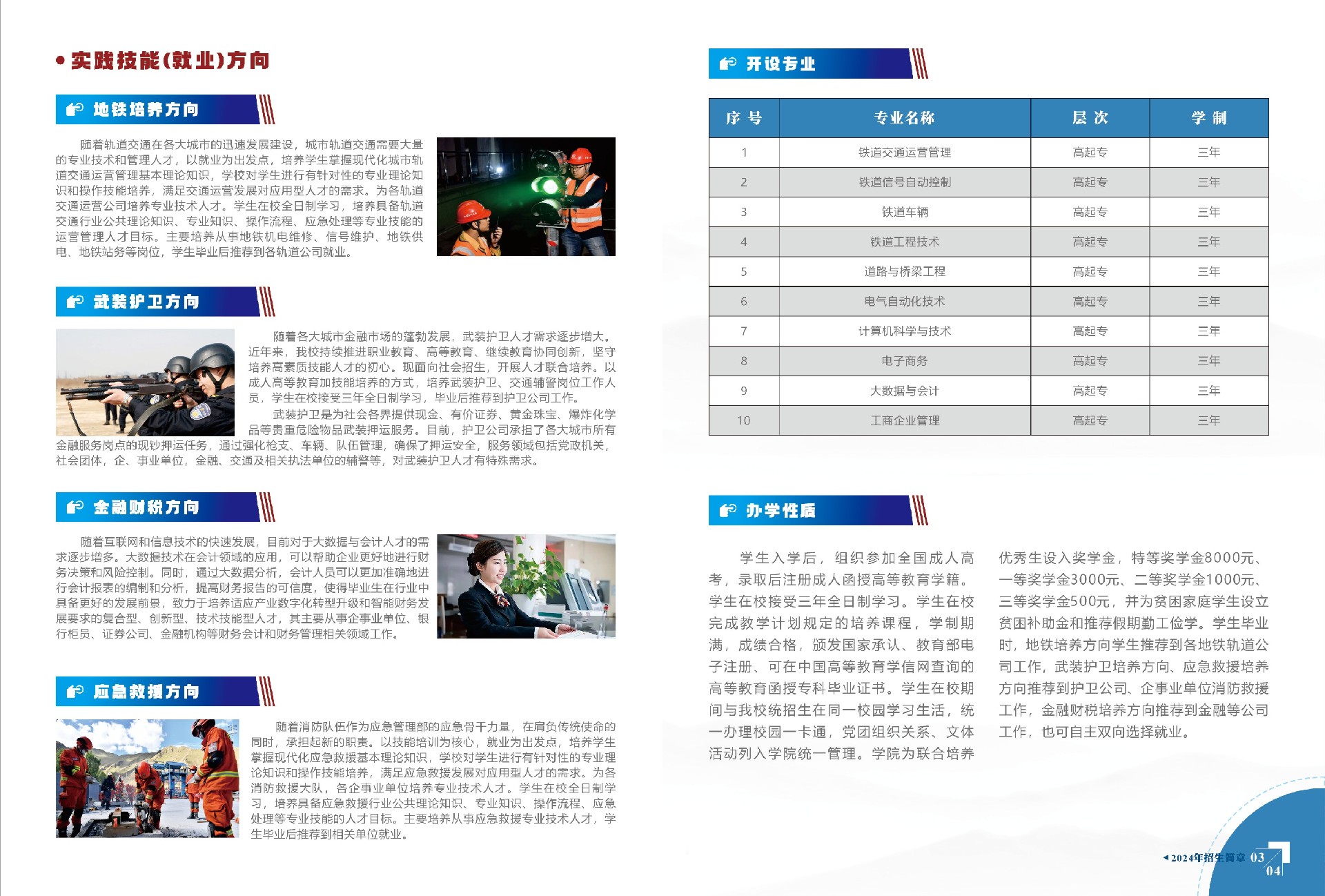 通過學校高質(zhì)量的師資進行理論教學,強化實踐性課程,使學生充分掌握專業(yè)技能。所學專業(yè)與企業(yè)實踐相結合,實現(xiàn)優(yōu)勢互補、資源共享。學生錄取后注冊成人高等教育學籍,在校進行三年全日制學習,完成教學計劃規(guī)定課程,學制期滿,成績合格,頒發(fā)高等教育函授專科畢業(yè)證書。學生畢業(yè)時,地鐵培養(yǎng)方向?qū)W生推薦到各地鐵軌道公司工作,武裝護衛(wèi)培養(yǎng)方向、應急救援培養(yǎng)方向?qū)W生推薦到護衛(wèi)公司和消防救援崗位工作。金融財稅培養(yǎng)方向推薦到金融會計方向就業(yè),也可自主雙向選擇就業(yè)。