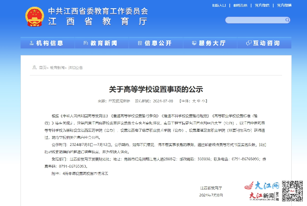 大江網(wǎng)/大江新聞客戶端訊 全媒體記者鄭周贇、實習生陳穎報道:7月9日,記者從江西省教育廳獲悉,江西擬設4所高等學校,目前正在公示中。具體來看,南昌工程學院更名江西水利電力大學(公辦)、以江西中醫(yī)藥高等專科學校為基礎設立江西醫(yī)藥學院(公辦),設置江西電子信息職業(yè)技術學院(公辦)、設置鷹潭衛(wèi)生職業(yè)學院(非營利性民辦)。