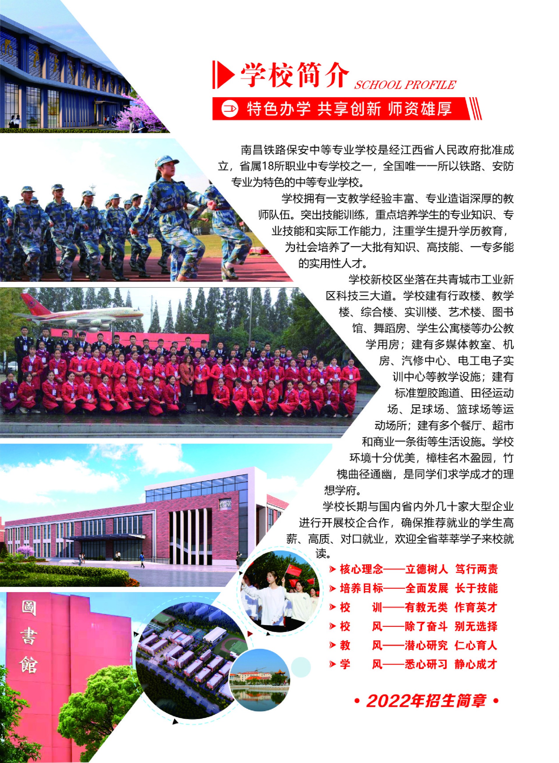 南昌鐵路保安中等專業學校是經江西省人民政府批準成立的省屬18所職業中專學校之一,全國唯一一所以鐵路、安防 專業為特色的中等專業學校。 學校擁有一支教學經驗豐富、專業造詣深厚的教 師隊伍。突出技能訓練,重點培養學生的專業知識、專 業技能和實際工作能力,注重學生提升學歷教育, 為社會培養了一大批有知識、高技能、一專多能 的實用性人才。 學校新校區坐落在九江市共青城市工業新區科技三大道。學校建有行政樓、教學 樓、綜合樓、實訓樓、藝術樓、圖書 館、舞蹈房、學生公寓樓等辦公教 學用房;建有多媒體教室、機 房、汽修中心、電工電子實 訓中心等教學設施;建有 標準塑膠跑道、田徑運動 場、足球場、籃球場等運 動場所;建有多個餐廳、超市 和商業一條街等生活設施。學校 環境十分優美,樟桂名木盈園,竹 槐曲徑通幽,是同學們求學成才的理 想學府。 學校長期與國內省內外幾十家大型企業 進行開展校企合作,確保推薦就業的學生高薪、高質、對口就業,歡迎全省莘莘學子來校就讀。