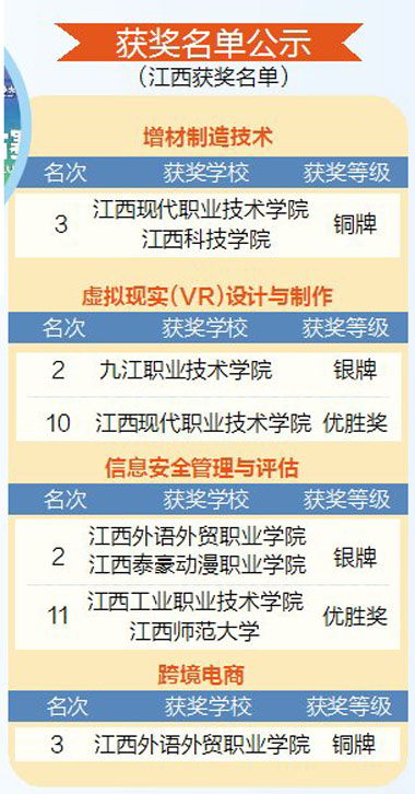 大江網/大江新聞客戶端訊 倫藝菲、江南都市報全媒體記者范晶報道:近日,首屆世界職業院校技能大賽獲獎名單公示。名單顯示,九江職業技術學院、江西外語外貿職業學院和江西泰豪動漫職業學院(聯合組隊)獲銀牌,江西外語外貿職業學院、江西現代職業技術學院和江西科技學院(聯合組隊)獲銅牌,還有多個學校(團隊)獲優勝獎。
