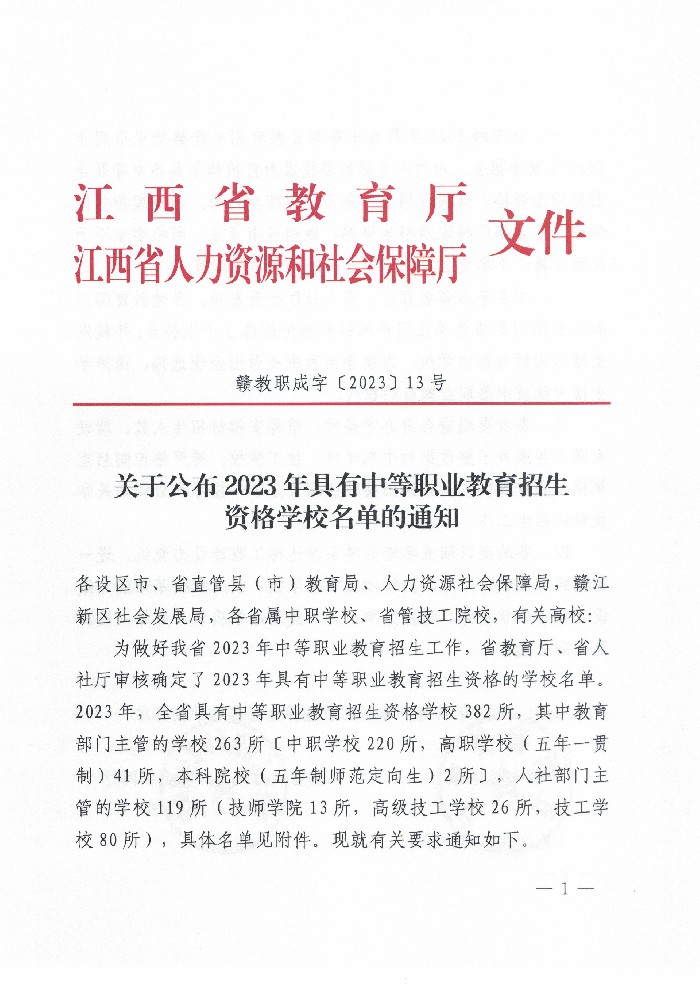 贛教職成字〔2023〕13號-關于公布2023年具有中等職業教育招生資格學校名單的通知.pdf