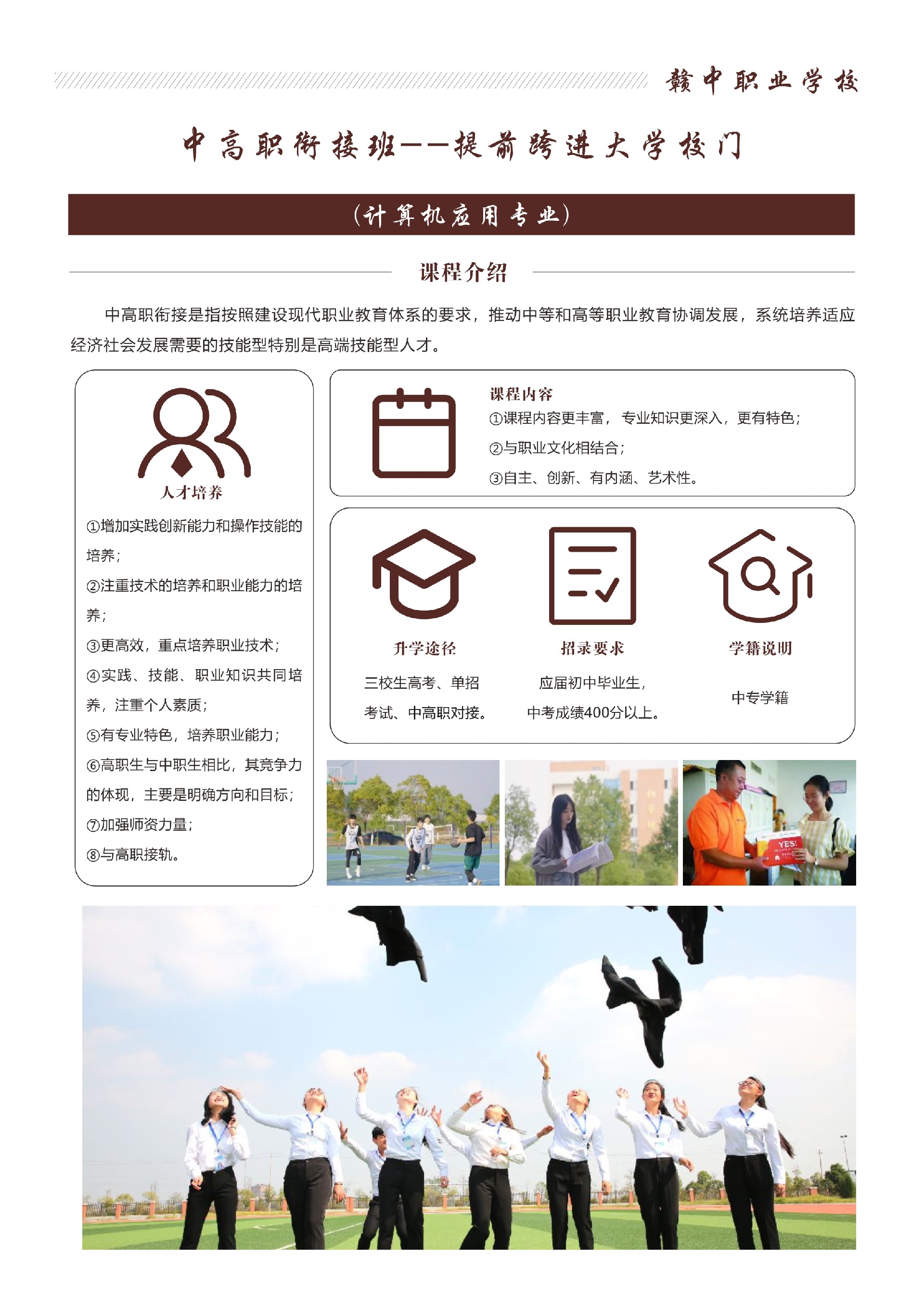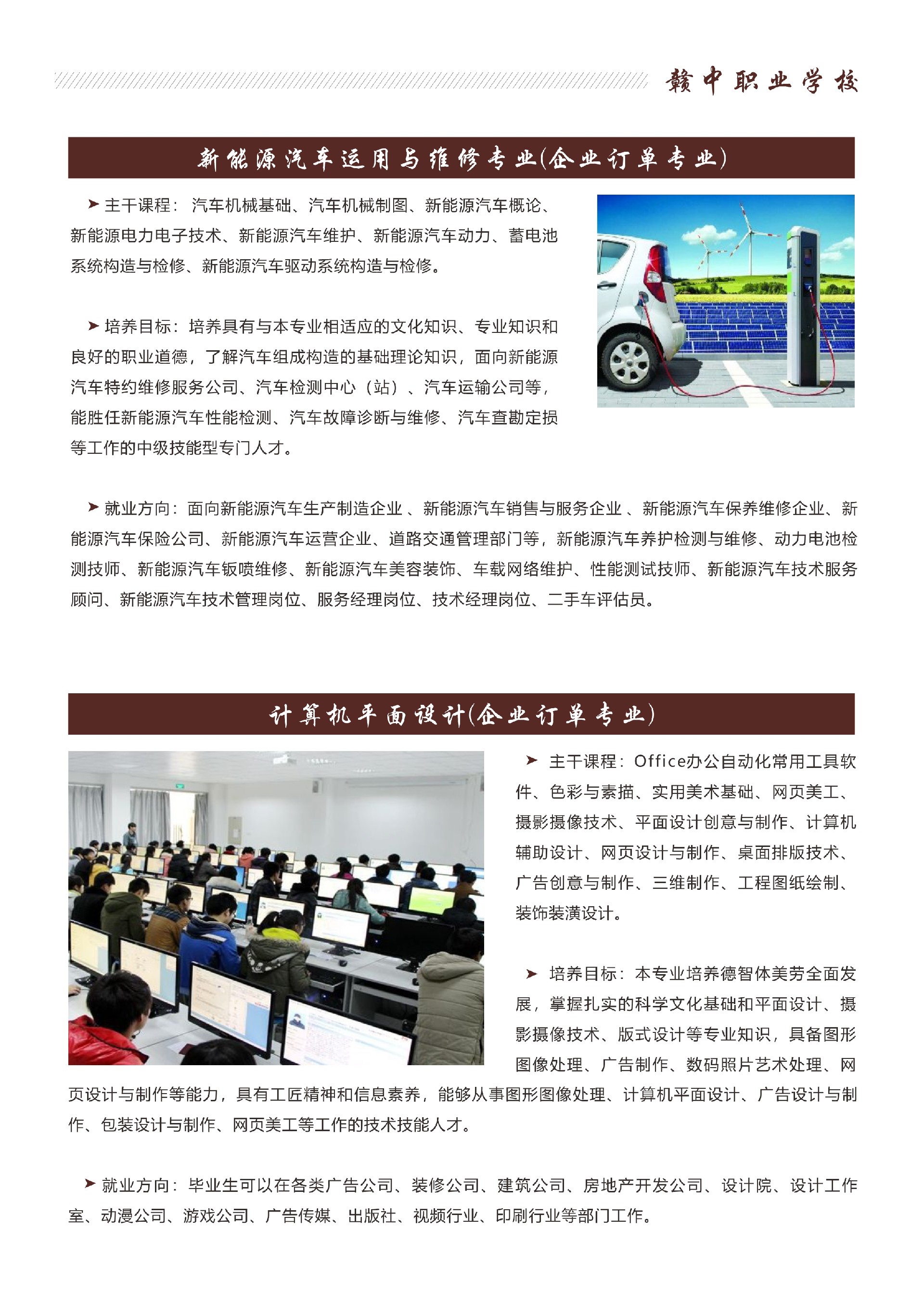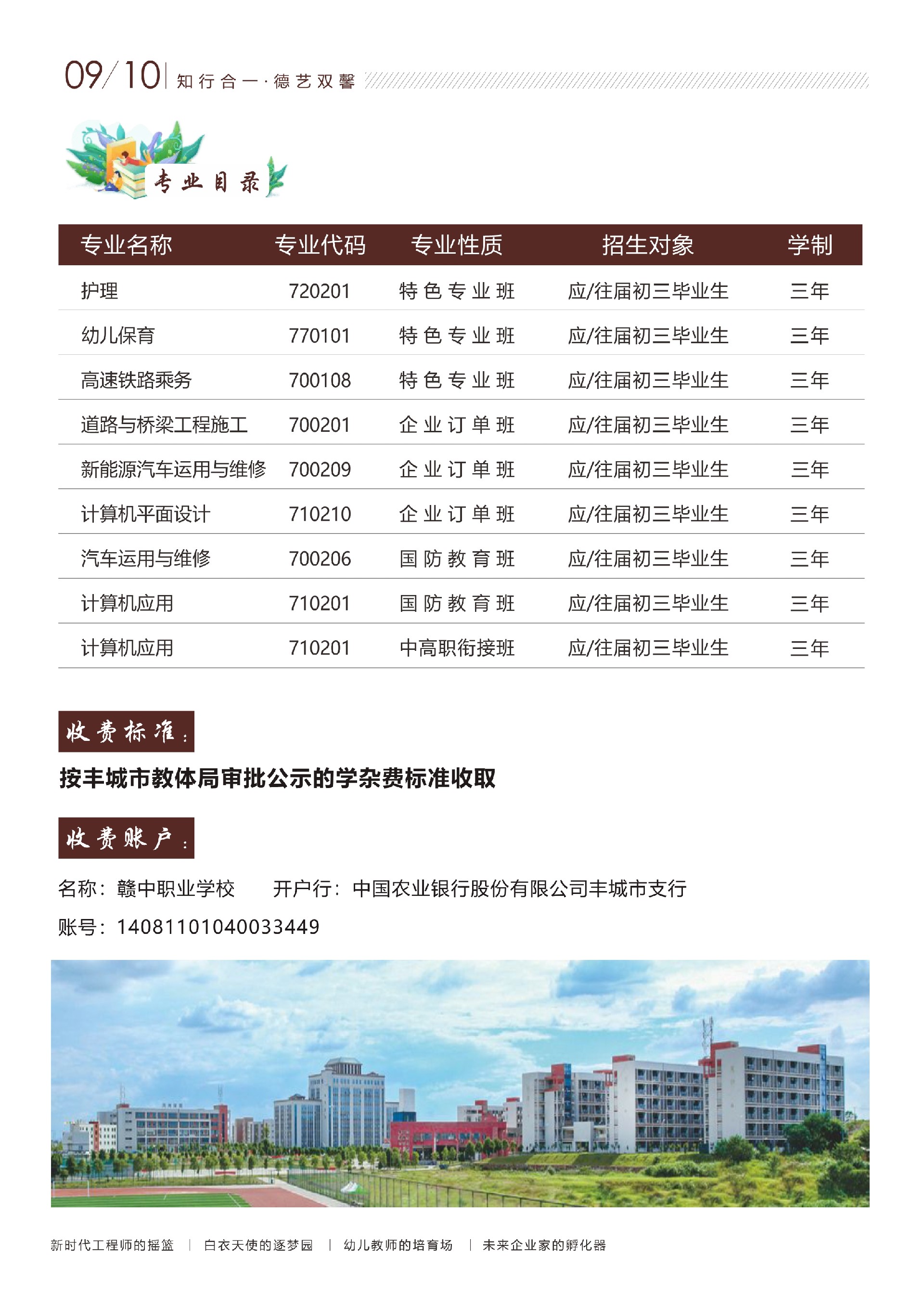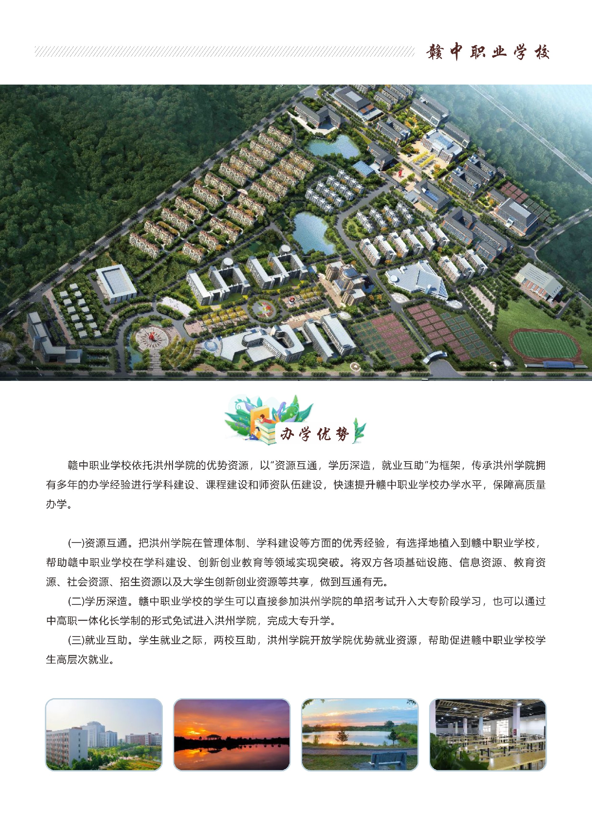 贛中職業學校是經豐城市教體局批準,江西省教育廳備案的一所全日制中等職業學校。學校位于江西省豐城市龍津湖總部基地大學城。 學校占地面積150余畝,先進的教學實訓設施,宏偉寬敞的室內室外運動場館一應俱全,數字化校園信息網覆蓋全校,圖書館藏書近10萬冊,各學科實驗室60多個,校內實訓中心3個,校外實訓基地20多個,可同時容納和滿足四千多名學生的學習和生活 學校以升學和就業為導向,以培養技術型、技能型人才為目標,開設了護理、幼兒保育、高速鐵路乘務、道路與橋梁工程施工、計算機平面設計、計算機應用、汽車運用與維修、新能源汽車運用與維修等八個專業,同時為滿足市場需求,將這些專業開設成特色專業班,企業訂單班,國防教育班和中高職銜接班以保障學生的升學和就業方向。 面向未來,學校全體教職員工秉承“知行合一、德藝雙馨”的校訓,堅持未來發展緊貼國家職業技能教育發展前沿,引入國家優質教育資源。辦特色職業教育,唱響贛中職業教育品牌,牢固樹立新發展理念,通過引入大量高端職業技能教學合作資源,為學生提供個性化、多渠道的升學和就業途徑,確保每位學生學以致用,成為多元化、有競爭力的復合型人才。