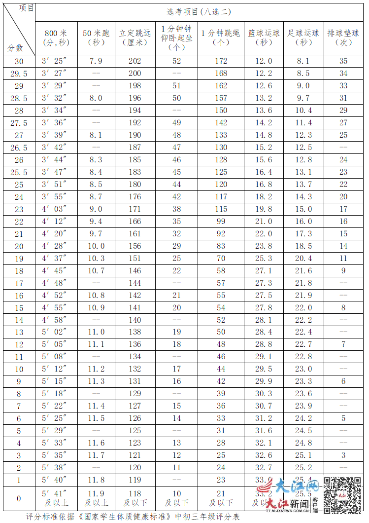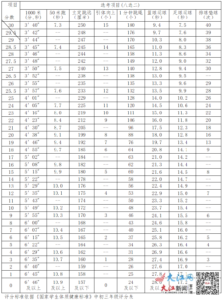 大江網/大江新聞客戶端訊全媒體記者肖彬莉報道:3月1日,南昌市教育考試院發布有關南昌市體育中考最新消息。根據江西省教育廳《關于認真做好2023年初中畢業生升學體育考試工作的通知》(贛教體藝字〔2023〕2號)精神,今年的初中畢業生升學體育考試政策作一些調整:南昌市2023年初中畢業生升學體育考試滿分60分,計入中考總成績,取消耐力跑作為必考項目,將耐力跑納入選考項目。考生選取兩個項目參加考試,每個選考項目各占30分。